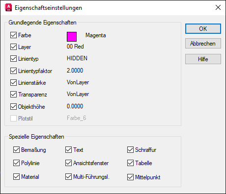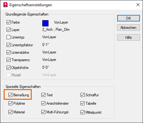 Unter Spezielle Eigenschaften werden Eigenschaften angewendet, die für den Quellobjekttyp spezifisch sind. Unter anderem für Bemaßungsobjekte, die den Bemaßungsstil enthalten.