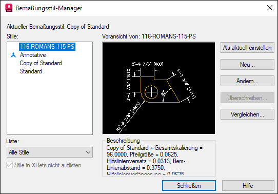 Die Bemaßung wird wie erwartet aktualisiert. Was noch besser ist: Wenn der Bemaßungsstil nicht existiert, wird er in der Zeichnung erstellt. Überprüfen Sie dies mit dem Befehl BEMSTIL. Finden