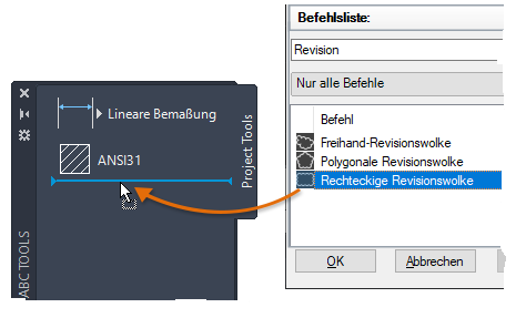 3. Ziehen Sie in der Liste Befehle den Befehl Rechteckige Revisionswolke in die Werkzeugpalette.