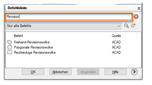 2. Klicken Sie im Editor zum Anpassen der Benutzeroberfläche (CUI-Editor), in der Leiste Befehlsliste, auf das Textfeld Befehlsliste durchsuchen, und geben Sie Revision ein.