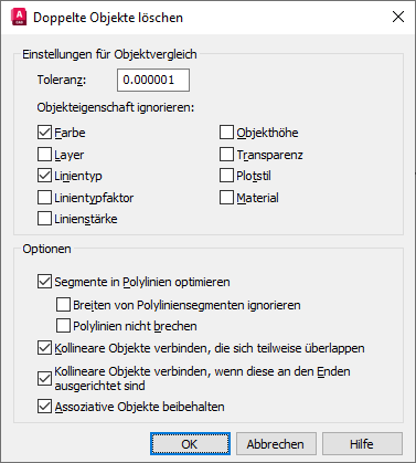 AUFRÄUM Entfernt doppelte Objekte oder überlappende Linien, Bogen und Polylinien. Kombiniert auch solche, die sich teilweise überlappen oder zusammenhängend sind.