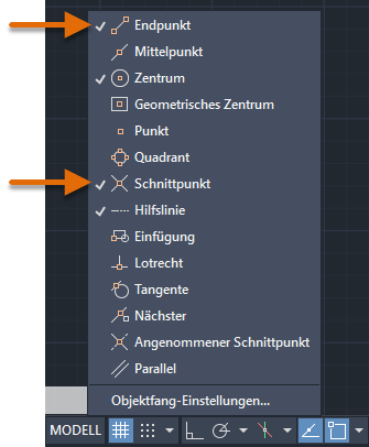 Klicken Sie mit der rechten Maustaste auf die Schaltfläche Objektfang, und wählen Sie sowohl Endpunkt als auch Schnittpunkt aus, wenn diese Optionen nicht bereits aktiviert sind.