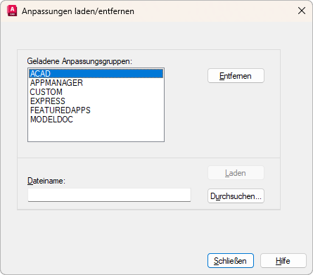 Gibt den Namen der Datei an, die beim Auswählen der Schaltfläche Laden geladen wird. Sie können entweder einen Dateinamen eingeben oder mit der Option Durchsuchen das Dialogfeld Anpassungsdatei wählen (ein Standarddialogfeld zur Dateiauswahl).