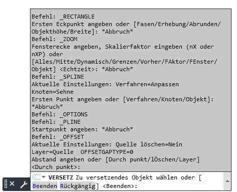 Wenn das Befehlsfenster nicht fixiert ist und Sie F2 drücken, wird oberhalb oder unterhalb der Befehlszeile eine Liste der Befehle oder Eingabeaufforderungen angezeigt, die Sie verwendet haben.
