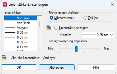 Für die Linienstärken stehen bestimmte Einstellungen zur Verfügung, einschließlich VONLAYER, VONBLOCK und VORGABE. Der Wert für VORGABE wird durch die Systemvariable LWDEFAULT festgelegt, die einen Ausgangswert von 0.01 Zoll oder 0.25 mm hat. Diese Vorgabeeinstellung gilt für alle neu erstellten Layer. Die Linienstärke 0 wird als ein Pixel im Modellbereich dargestellt, beim Plotten wird die dünnste verfügbare Linienstärke des angegebenen Plot-Geräts verwendet.