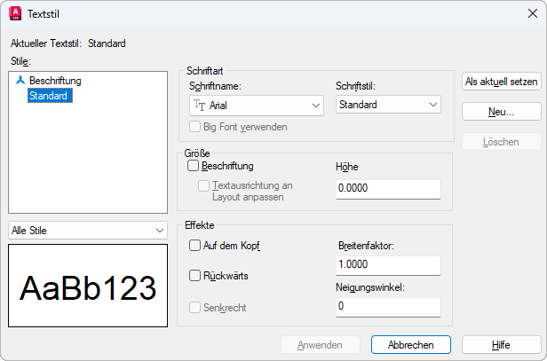 Wendet Stiländerungen, die im Dialogfeld vorgenommen werden, auf den aktuellen Stil und den Text mit dem aktuellen Stil in der Zeichnung an.