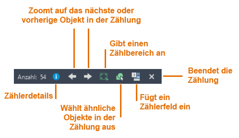 Alle Exemplare des angegebenen Objekts werden markiert, und das Ergebnis der Zählung wird im Werkzeugkasten Anzahl angezeigt. Dieser Werkzeugkasten enthält verschiedene Befehle und Optionen zum Prüfen und Verwalten der Objekte in der Zählung.