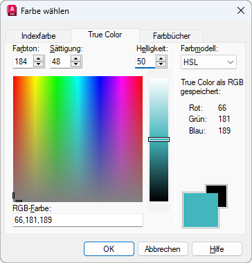 Gibt das RGB-Modell zur Auswahl der Farben an. Die Optionen auf der Registerkarte True Color sind je nach Auswahl des Farbmodells unterschiedlich.
