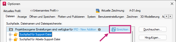 Anmerkung: Wenn die Option Einrichten nicht angezeigt wird, wurde das Projekt möglicherweise bereits konfiguriert. Dies kann anhand der Anzeige des Texts "Aktuelle Zeichnung verwendet projektbezogene Einstellungen" überprüft werden.