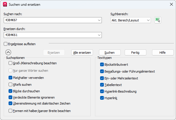 Beispiel: Ihre Zeichnung enthält mehrere ähnliche Bauteile. Wenn Sie sie aber alle in 4384K61 ändern möchten, geben Sie 4384K6? im Feld Suchen nach und 4384k61 im Feld Ersetzen durch ein.