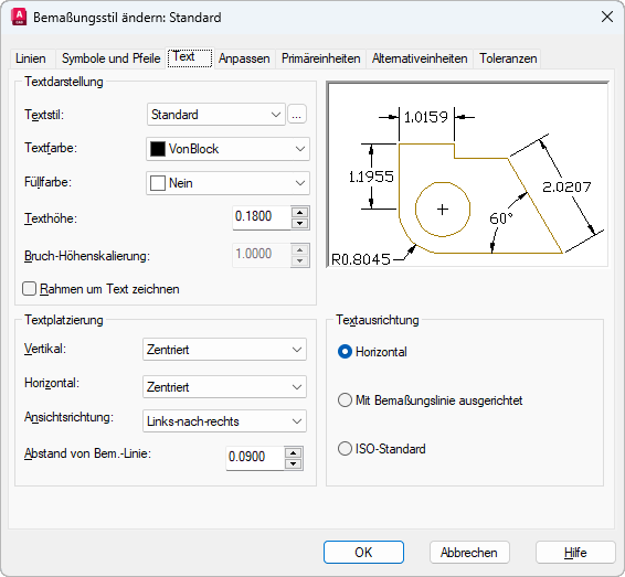 Wenn der auf dieser Registerkarte angegebene Textstil über eine feste Texthöhe verfügt, überschreibt dieser Wert die hier festgelegte Texthöhe. Wenn Sie die Höhe für den Maßtext hier festlegen möchten, stellen Sie sicher, dass die Höhe des Textstils auf 0 gesetzt ist. Weitere Informationen zum Festlegen der Texthöhe für Textstile finden Sie unter dem Befehl STIL.