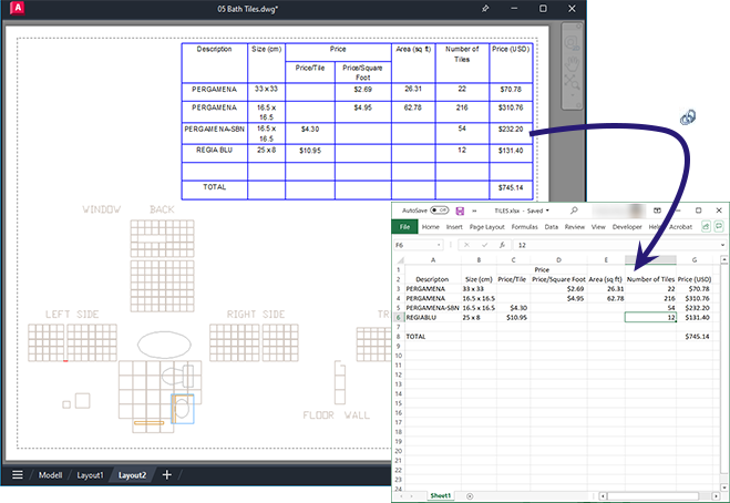 Wenn Änderungen an einem verknüpften Arbeitsblatt vorgenommen wurden (z. B. durch Hinzufügen einer Zeile oder Spalte), kann die Tabelle in Ihrer Zeichnung mit dem Befehl DATENVERKNAKT entsprechend aktualisiert werden. Wurde analog dazu eine Änderung an einer Tabelle in Ihrer Zeichnung vorgenommen, können Sie das verknüpfte Datenblatt mit dem gleichen Befehl aktualisieren.