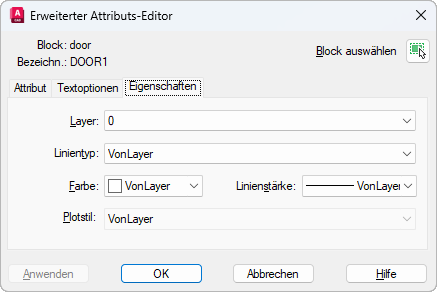 Definiert den Layer, auf dem sich das Attribut befindet, sowie die Linienstärke, den Linientyp und die Farbe für den Attributtext. Wenn die Zeichnung Plotstile verwendet, können Sie dem Attribut auf der Registerkarte Eigenschaften einen Plotstil zuweisen.