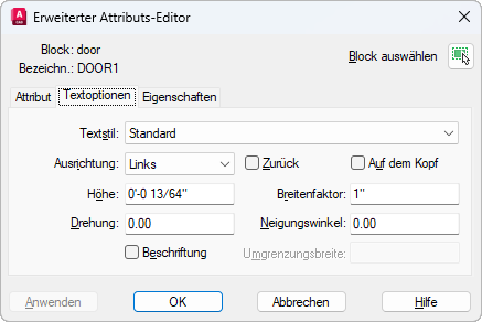 Bestimmt die Eigenschaften, die festlegen, wie ein Attributtext in der Zeichnung angezeigt wird. Die Farbe des Attributtextes können Sie auf der Registerkarte Eigenschaften ändern.