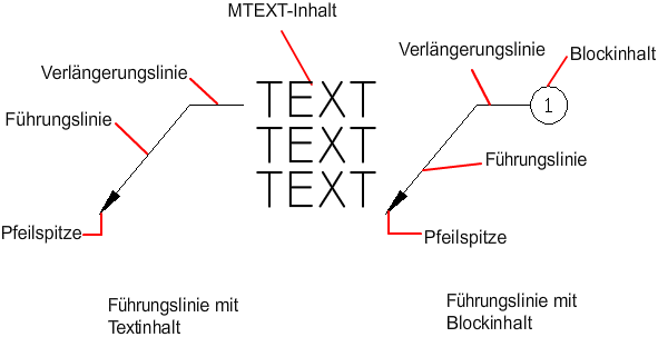 Ein Führungsobjekt ist eine Linie oder ein Spline mit einer Pfeilspitze an einem Ende und einem Absatztextobjekt oder -block am anderen.