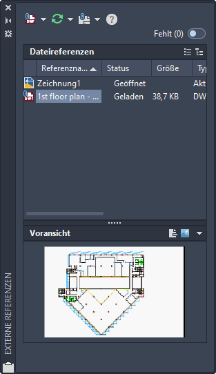 Sie können dateispezifische Informationen über die Unterlagen, die einer Zeichnung zugeordnet sind, in der Palette Externe Referenzen anzeigen. Sie können Unterlagen auch laden und entfernen sowie andere Vorgänge ausführen.