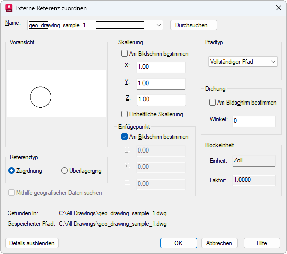 Wählen Sie den vollen (absoluten) Pfad, den relativen Pfad zur Datei der externen Referenz oder Kein Pfad sowie den Namen der Bilddatei aus (die Bilddatei muss sich in demselben Ordner wie die aktuelle Zeichnungsdatei befinden).