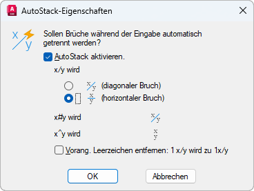 Der Schrägstrich (/) wird in einen horizontalen Bruch konvertiert, wenn AutoStack aktiviert ist.