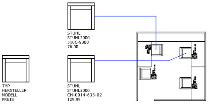 Wenn Sie mehrere Attribute gemeinsam verwenden möchten, fügen Sie sie nach dem Definieren in denselben Block ein. Sie können beispielsweise Attribute mit der Bezeichnung "Typ", "Hersteller", "Modell" und "Kosten" definieren und diese anschließend als einen Block mit dem Namen STUHL einfügen.