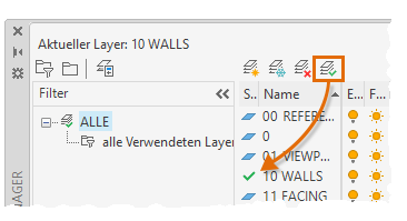 Alle neuen Objekte werden vorgabemäßig auf dem aktuellen Layer gezeichnet. Das grüne Häkchen im Layereigenschaften-Manager zeigt den aktuellen Layer an.