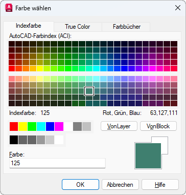 Auf drei Registerkarten stehen die 255 Farben des AutoCAD-Farbindex (ACI), True Colors und Farbbuch-Farben zu Auswahl.