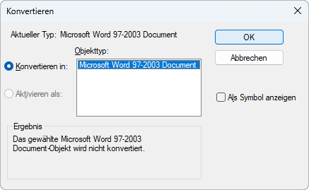 Öffnet das eingebettete Objekt im unter Objekttyp ausgewählten Typ, konvertiert es jedoch nach seiner Bearbeitung zurück in dessen aktuellen Typ.