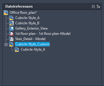 Auf der obersten Ebene der Strukturansicht wird immer die aktuelle Zeichnung angezeigt Referenzierte Dateien erscheinen auf der nächsten Ebene. Referenzierte Dateien, die wiederum eigene verschachtelte Dateireferenzen enthalten, lassen sich öffnen, um weitere Ebenen anzuzeigen. Beim Auswählen von Dateireferenzen in der Strukturansicht kann jeweils nur eine Dateireferenz ausgewählt werden.