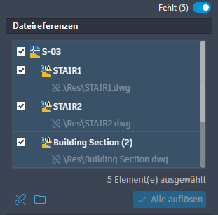 Bereich Dateireferenzen (Status Nur fehlende Referenzen anzeigen)
