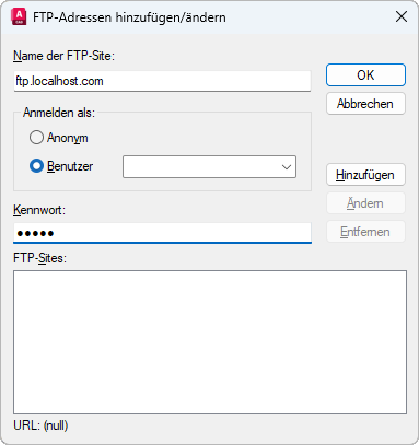 Um das Dialogfeld FTP-Adressen hinzufügen/ändern aufzurufen, wählen Sie in einem Standarddialogfeld zur Dateiauswahl die Option Extras