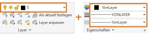 Verwenden Sie auf der Registerkarte Start der Multifunktionsleiste die Gruppen Layer und Eigenschaften, um die Einstellungen für die Einstellungen zu prüfen oder zu ändern, die am häufigsten verwendet werden: Layer, Farbe, Linienstärke und Linientyp.