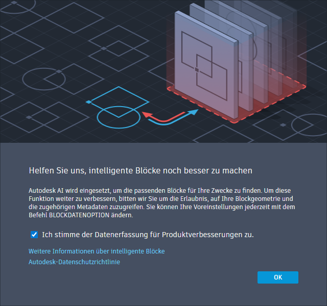 Wenn Sie die Funktion zum Ersetzen oder Konvertieren von Blöcken zum ersten Mal verwenden, wird ein Einverständnisdialogfeld angezeigt, in dem der Zugriff auf Ihre Blockdaten angefordert wird. Durch die Freigabe Ihrer Inhaltsdaten kann AutoCAD die Blockvorschläge und andere Optionen der Funktion verbessern. Sie können Intelligente Blöcke jedoch auch dann verwenden, wenn Sie Ihre Daten nicht zur Produktverbesserung weitergeben möchten.
