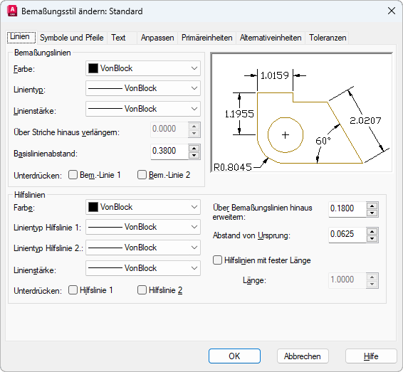 Zur Bestimmung des Formats und der Eigenschaften von Maßlinien, Hilfslinien, Pfeilspitzen und Zentrumsmarken.