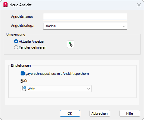 Speichert eine neue benannte Ansicht aus der Anzeige im aktuellen Ansichtsfenster oder durch Definition eines rechteckigen Fensters.