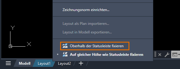 Klicken Sie mit der rechten Maustaste auf die Registerkarte Modell oder Layout, und wählen Sie Oberhalb der Statusleiste fixieren oder Auf gleicher Höhe wie Statusleiste fixieren.