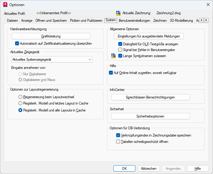 Für die Aktualisierung der Anzeigeliste auf den Registerkarten gibt es zwei Möglichkeiten: Entweder wird beim Aufrufen der Registerkarte die gesamte Zeichnung neu generiert, oder es werden nur die geänderten Objekte neu generiert. Durch das Ändern dieser Einstellungen kann die Leistung verbessert werden. (Systemvariable LAYOUTREGENCTL)