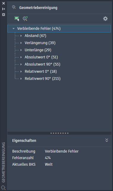 Öffnet die Palette Geometriebereinigung, in der potenzielle Abstands-, Verlängerungs-, Unterlängen- und Winkelfehler für die aktuelle Zeichnung angezeigt werden.