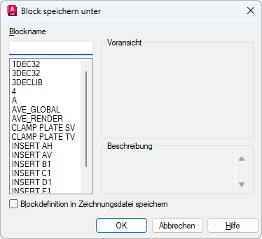 Speichert die Blockdefinition als Zeichnungsdatei. Wenn dazu eine bereits bestehende Zeichnungsdatei ausgewählt wird, wird diese überschrieben. Standardmäßig wird der angegebene Blockname als Name der Zeichnungsdatei verwendet.