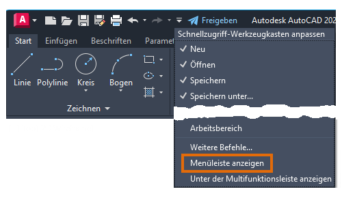 Die Menüleiste kann über die Dropdown-Liste des Schnellzugriffs-Werkzeugkastens oder durch Anpassen der Benutzeroberfläche mit dem Befehl ABI aktiviert werden.