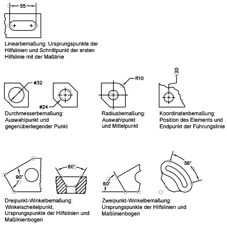 Die Definitionspunkte für jede Bemaßungsart sind in der nachstehenden Abbildung gekennzeichnet. Der Mittelpunkt des Maßtexts ist ein Definitionspunkt für alle Bemaßungsarten.