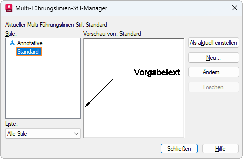 Legt den in der Liste Stile ausgewählten Stil als aktuellen Stil fest. Alle neuen Multi-Führungslinien werden mit diesem Stil erstellt.
