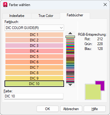Auf der Registerkarte Farbbücher wird der Name des ausgewählten Farbbuchs angezeigt.