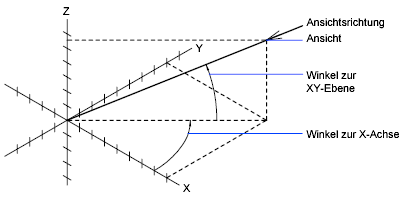 Sie können eine Ansichtsrichtung festlegen, indem Sie die Koordinatenwerte eines Punkts oder die Maße für zwei Drehwinkel angeben.
