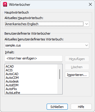 Zeigt den Namen des aktuellen Benutzerwörterbuchs an. Die Erweiterungcus wird für AutoCAD-Benutzerwörterbücher verwendet.