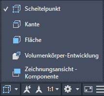 | Finden | Objekte isolieren | Ausgewählte Objekte im Zeichnungsbereich werden ausgeblendet, zuvor ausgeblendete Objekte angezeigt. |