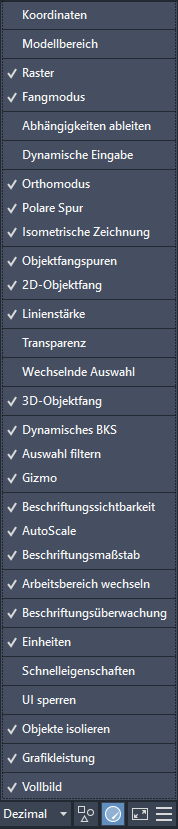 Die Statusleiste bietet schnellen Zugriff auf Werkzeuge, die sich auf die Zeichnungsumgebung auswirken.