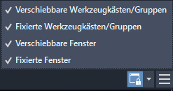 | Finden | UI sperren | Sperrt die Position und Größe von Werkzeugkästen und fixierbaren Fenstern, beispielsweise DesignCenter und Eigenschaftenfenster. |