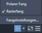 | Finden | Fangmodus | Aktiviert das Fangen am Raster. Wenn Objektfänge aktiviert sind, fängt der Cursor angegebene Rasterintervalle, während er bewegt wird. Bei aktiviertem Polar-Fangmodus fängt der Cursor in bestimmten Abständen entlang angegebener polarer Ausrichtungspfade. |