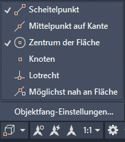 | Finden | 2D-Objektfang | Fängt den Cursor am nächstgelegenen 2D Referenzpunkt, während Sie ihn bewegen. Beispielsweise Endpunkte, Mittelpunkte von Kreisen, Mittelpunkte und so weiter. |