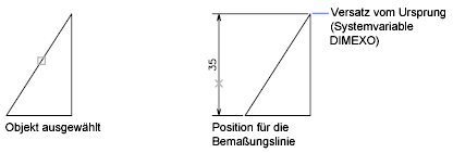 Wenn Sie eine Linie oder einen Bogen auswählen, dienen deren Endpunkte als Ursprünge der Hilfslinien. Die Hilfslinien werden um den Abstand von den Endpunkten versetzt, den Sie unter Abstand von Ursprung auf der Registerkarte Linien und Pfeile im Dialogfeld Neuer Bemaßungsstil, Bemaßungsstil ändern bzw. Aktuellen Bemaßungsstil überschreiben angegeben haben. Weitere Informationen hierzu finden Sie unter DIMSTYLE. Dieser Wert wird in der Systemvariablen DIMEXO gespeichert.
