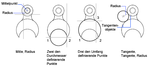 Es gibt mehrere Möglichkeiten zum Erstellen von Kreisen. Die Vorgabemethode besteht darin, den Zentrumspunkt und den Radius anzugeben. In der Abbildung werden drei weitere Möglichkeiten zum Zeichnen eines Kreises dargestellt.